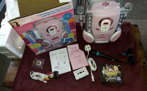 YOU ARE BUYING A BARBIE CD+G KARAOKE MACHINE FROM 2003. COSMETICALLY THE MACHINE IS IN GREAT SHAPE WITH BARELY A MARK ON IT AND LOOKS TO HAVE HAD LITTLE USE. I TESTED BOTH TAPE AND CD AND BOTH WORKED GREAT. I TESTED THE MICS AND WHILE MIC 1 WORKED FINE WITH NO PROBLEMS AT ALL MIC 2 ACTED STRANGELY AS IN WHEN YOU WOULD TAP ON THE MICROPHONE THAT WOULD WORK FINE BUT WHEN YOU TRIED TO SPEAK OR SING THROUGH IT IT DID NOT COME THROUGH THE SPEAKERS, MIGHT BE FIXABLE BUT ANYWAY AS AN EXTRA I HAVE INCLUDED A WIRED SINGSTAR MICROPHONE AND ADAPTOR WHICH WORKS GREAT (AND WILL SAVE YOU MONEY ON BATTERIES IF YOU USE IT ALOT!). ALSO INCLUDED ARE ALL THE BITS THAT COME WITH THE MACHINE SUCH AS POWER LEAD AND CONNECTOR CABLE ETC, A CD WITH MUSIC TO SING ALONG WITH AND A TAPE TO RECORD THEM ON TO ALONG WITH INSTRUCTIONS. AS WELL AS THE EXTRA SINGSTAR MIC THERE IS A 3 DISC CD PACK WITH MUSIC ON IT IN THE CD+G FORMAT WHICH ARE MADE SPECIFICALLY FOR KARAOKE MACHINES. THE ITEM IS BOXED WITH ORIGINAL POLYSTYRENE (BOX MISSING LID). A NICE LITTLE UNIT AND HARD TO GET HOLD OF AS I COULDN’T FIND IT ANYWHERE HERE ON EBAY. WILL BE WELL PACKED AND POSTED VIA TRACKED, INSURED AND SIGNED FOR COURIER. ANY QUESTIONS PLEASE ASK. IF YOU WANT IT NEXT DAY DELIVERY IN TIME FOR CHRISTMAS THAT WILL COST AN EXTRA 5 SO PLEASE MESSAGE ME IF YOU WANT THIS OPTION OTHERWISE STANDARD DELIVERY IS INCLUDED WITH THE PRICE.