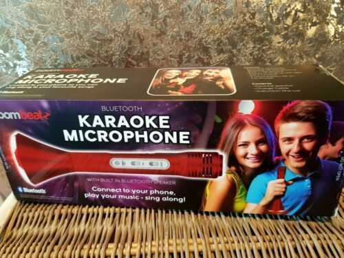 Boombeatz Bluetooth Karaoke Speaker and Microphone LED Colour changing in Red. Condition is Brand New and SealedBoombeatz Bluetooth Karaoke Microphone. Have some party fun with family and friends with this brilliant bluetooth microphone. Connect your mobile phone over bluetooth, play a song and sing along to it, projecting your fantastic singing voice through the microphone! Change the colour of the lights flashing and even control the volume all on the side with a simple flick of a switch.Playback your music from your device via bluetooth and singalong Built in 3w speaker Colour changing led light Echo function 3 hours battery life on full charge