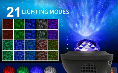 Specifications: Brand: U`King Model: ZQ00526001Item colorblack Shell material: plastic Power: 8W Current: 5V 2A Input voltage: AC 110-220V Output voltage: 5V/2000MA Number of lamp beads: 2, 4W Light source: LED+green laser Lighting effect: RGBW Control modemanualremote Power supply mode: USB cable power supply (mobile power, computer, mobile phone adapter) Protection level: IP33 Music mode: U disk, card reader, Bluetooth Bluetooth Number: IGB-001 Use scenarios: family activities, bedroom atmosphere lights, friends gathering, performance activities to create galaxy star night atmosphere Product size: 16*16*13cm  Galaxy Starry Night Light LED Star Projector Lamp Ocean Wave Projection Party UK Specifications: