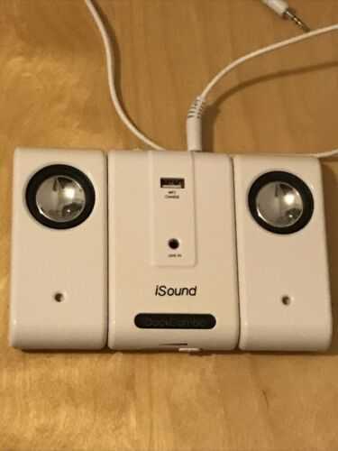 i Sound Portable Speaker System/i Dock ComboIn exellent working order with instructionsSlight plastic discourationUSB output allows to charge MP3 PlayerBattery Compartment for Outdoor useLightweight designDeep Bass and astonishing Treble soundsSize 17cm x 11 cm x 2.5 cmMains adaptor included