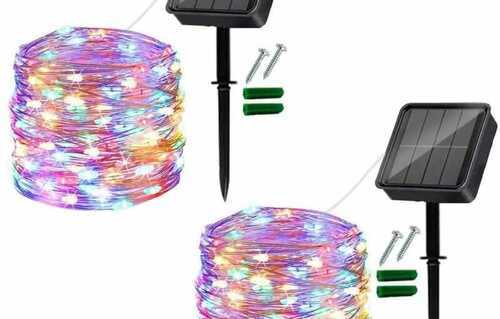 Solar String Lights Outdoor, 2 Pack 120LED Powered Fairy Colored Description Super Bright Solar String Lights: 120 super bright LED , 2 Pack solar powered string lights with 40ft length of light and 6ft lead cable, 46ft together,Enough Length to fit any indoor and outdoor space. Ideal for decorating your gardens, porch, lawn,bedroom, patio, deck, front porch, flower fence, party etc. Easy to DIY and Widely Used: Flexible fairy lights, no tools required, can easily build into the shapes you want; simply wrap around tree trunks or gazebos , patio, furniture; when darkness, the wire fades to invisible, leaving only the bright lights. 8 Modes and Upgrade Battery: 2 switches (Power ON/OFF, Mode changing), press mode button selects 8 different modes to satisfy your diverse needs. Upgraded Solar Panel to more efficient exchange rate and HIGH battery capacity which increase to 800MaH, 6-8 hours charging in the daytime can provide 8-14 hours working time in the night. IP65 Waterproof and Auto On/Off: Both the string lights and the solar panel are IP65 Waterproof, make it suitable for both indoor and outdoor use, not worry about short circuit or weather damage. These solar string lights can charge during the day and automatically turn on at dusk and off at dawn.