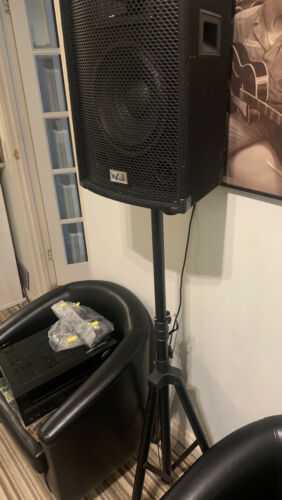 Amplifier and Two Speakers With Gorilla Stand. Condition is “Used”.Please note each speaker comes with a stand and a microphone is also included